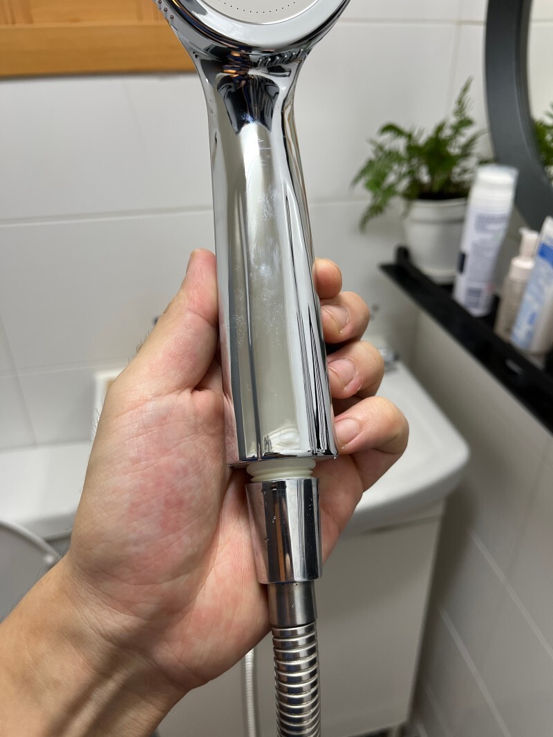 이렇게 아래에 샤워호스를 시계 반대방향으로 돌려주면 기존의 샤워헤드가 탈거가 되고요. 이후에 다이소몰에서 구입한 샤워헤드에 맞춰서 호스를 시계 방향으로 돌려주면 설치 끝! 참 쉽죠잉?