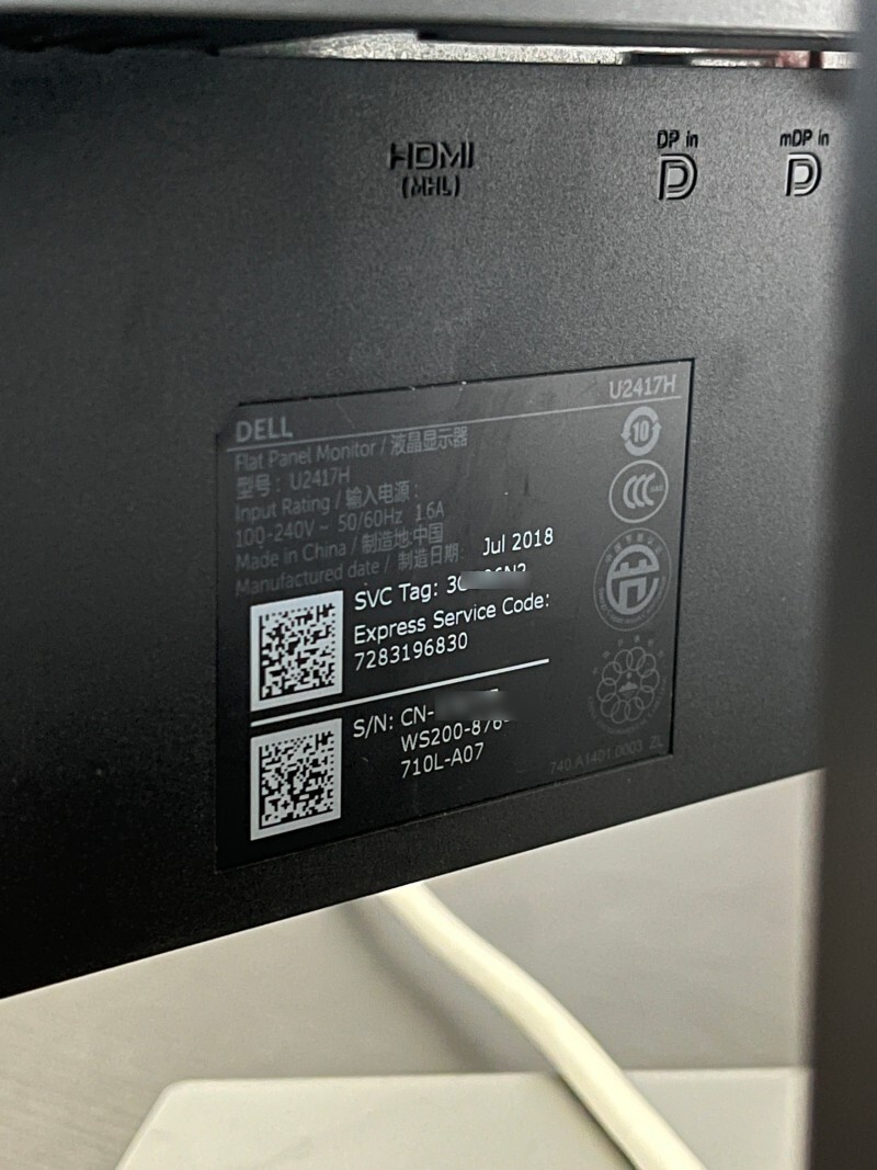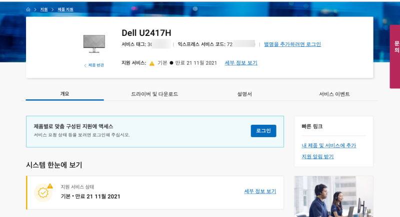 그래서 우선 델 홈페이지에 들어가서 제 모니터의 보증기간부터 확인해보았습니다. 보증 기간은 모니터 뒤편에 시리얼 번호(S/N)를 홈페이지에 입력하면 간편하게 확인할 수 있습니다.