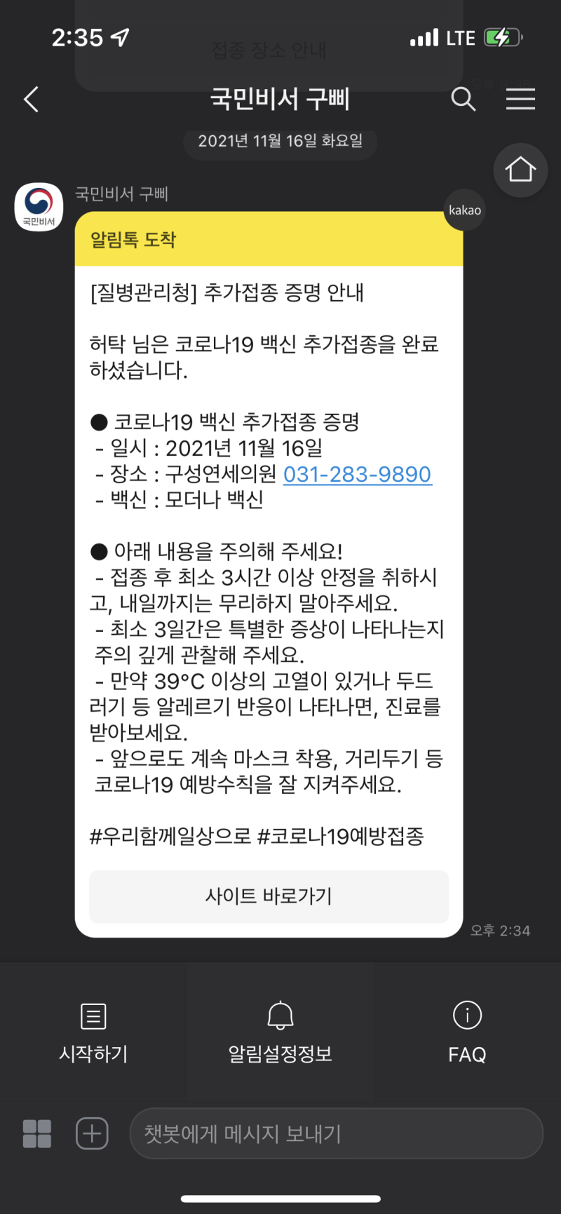 퇴원 후 집에 돌아가는 길에 국민비서 구삐에서 추가접종 증명 안내에 대한 메세지를 보내주었고요. 이렇게 함으로써 저의 얀센 + 모더나 부스터샷 접종이 마무리 되었습니다.
