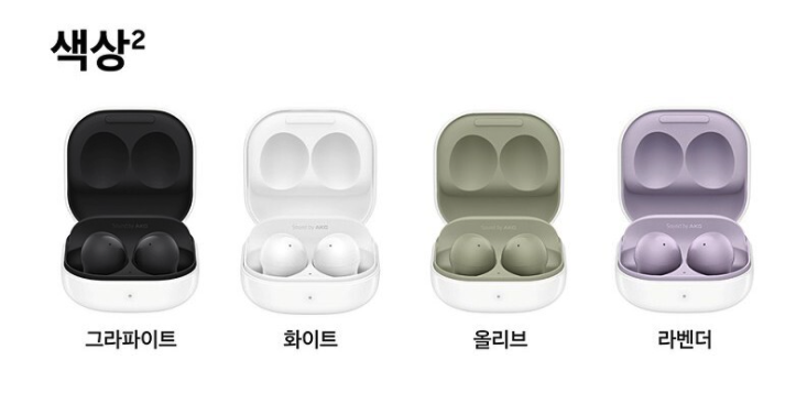 갤럭시 버즈는 하나당 5g으로(이전 모델인 버즈 프로는 각각 6.3g), 갤럭시 버즈2는 지금까지 나왔던 삼성 무선 이어폰중 가장 가벼운 이어폰입니다. 사각 충전케이스 외부는 전부 화이트이지만, 버즈 자체와 케이스 내부같은 경우는 그라파이트, 화이트, 올리브, 라벤드 총 4가지 색상을 선택할 수 있습니다.
