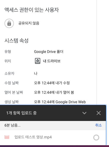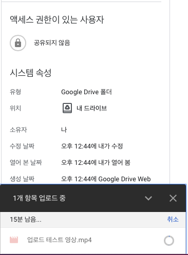마지막으로 비교해볼 인터넷 속도측정은 바로 대용량 파일의 업로드 속도인데요. 저는 테스트 삼아서 786.3MB 크기의 mp4 영상 파일을 한번 저의 개인 구글 드라이브에 업로드 해보았습니다.