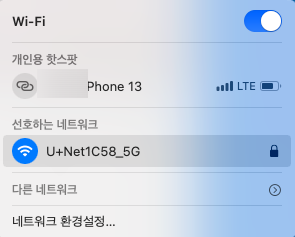 우선 저의 아이폰 핫스팟을 열어서 맥북에 연결해보았습니다. 집에 인터넷이 없을 당시에 약 한달간 이 아이폰13의 자동 핫스팟 연결로 인터넷을 사용하였는데요.
