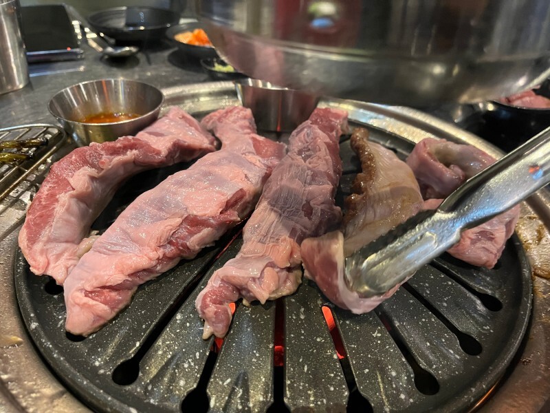 이렇게 사장님이 안바쁠때는 직접 구워주시고 잘라주시는데 이 날은 테이블이 꽉꽉 들어차서 그런지 사장님이 엄청 바빠보이셨어요. 저희가 셀프로 조금 굽다가 사장님이 얼른 오셔서 고기를 잘라주셨습니다.