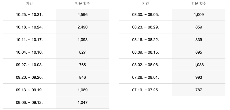 그러다가 10월 18일에서 10월 24일 주차에 방문자 숫자가 기존 대비 무려 2.5배 증가한 2500명대로 늘어났는데요!