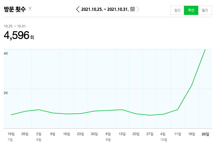 그때부터 조금씩 방문자가 늘어나더니 10월 말경에는 확실히 방문자 수가 급증한 것을 체감할 수 있었어요.
