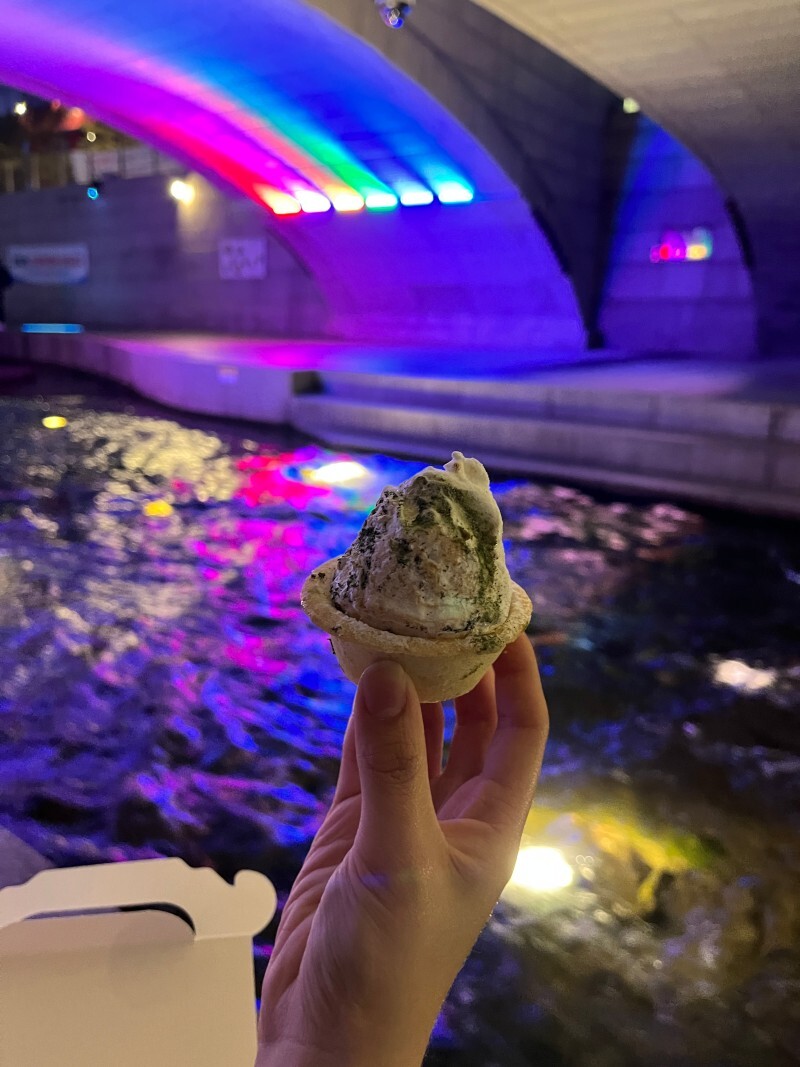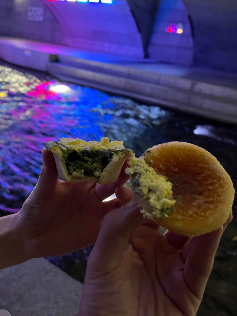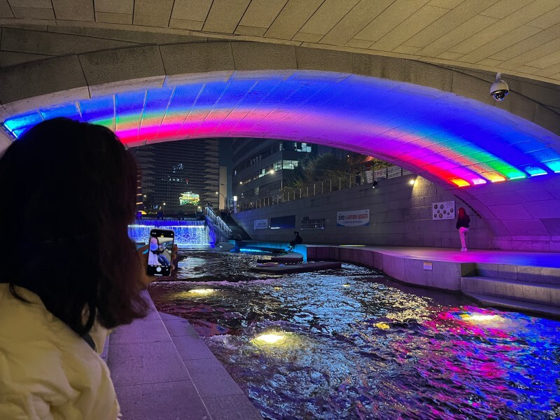 이렇게 밤에 가면 낮과는 다른 청계천의 모습을 볼 수 있습니데이~ 둘이서 신나서 사진도 찍어보구요. 적당한 곳에 앉아서 키쉬미뇽 타르트를 바로 한번 먹어봤습니다.