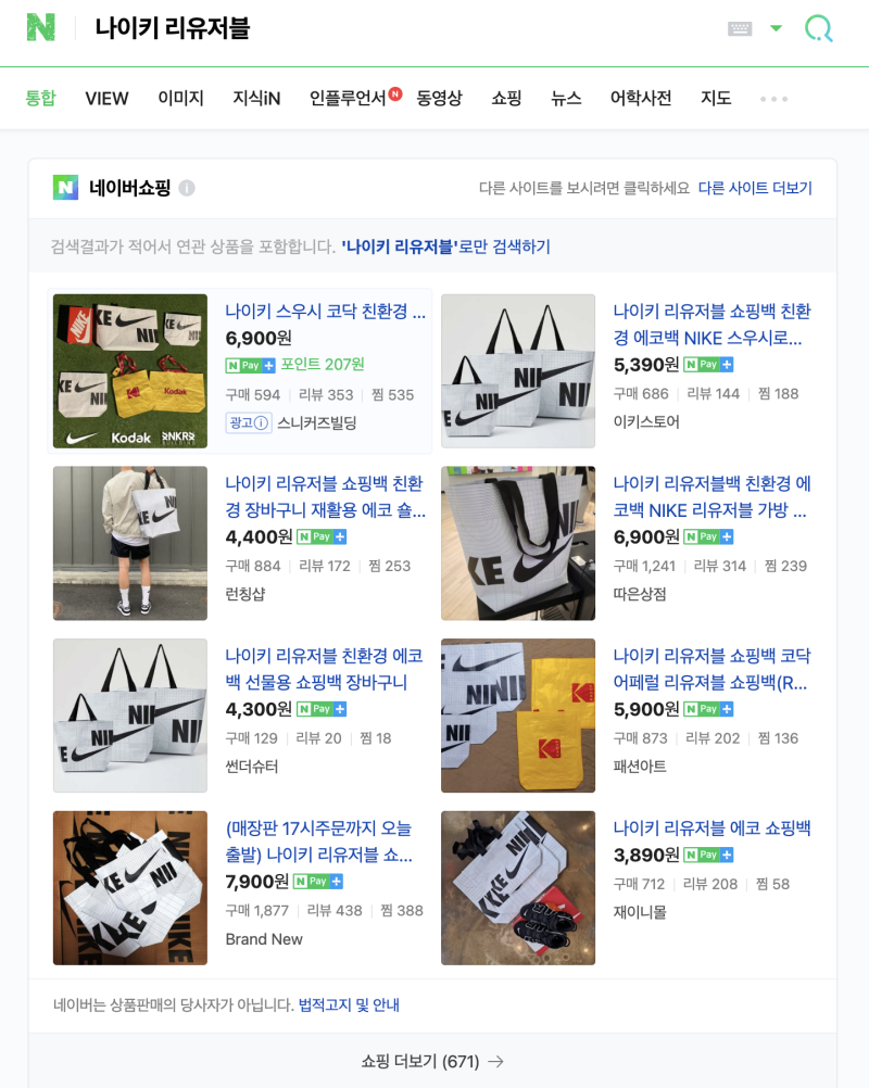 요즘 나이키 리유저블 쇼핑백이 정말 화재죠? 이미 네이버 쇼핑몰에서는 가격을 조금 더 붙여서 파는 리셀이 많이 진행