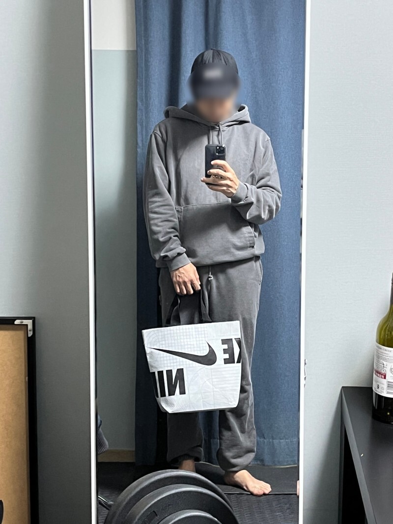 정리가 안된 흐줄근한 저의 운동방.. 바벨이 여기저기 널부러져 있네요..ㅋㅋ 맨 위쪽 부터 나이키 리유저블 쇼핑백 S사이즈, 중간이 M 사이즈, 마지막이 L사이즈 입니다.