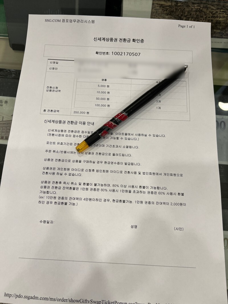 그런데!! 문제가 있었으니.. 제가 가진 신세계상품권이 구권이라서 스크래치가 없었다는 사실.. 당연히 스크래치가 없으니 핀번호도 없었기 때문에 SSG MONEY로 전환 할 수가 없었어요.