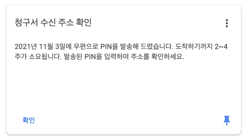 주소 확인 창에 들어가서 청구서 주신 주소로 받은 PIN 번호를 입력하면 드디어 완료입니다! 주의할 점을 시도는 총 3번 밖에는 할 수 없으니 신중하게 번호를 누르시기를 추천드려요..!