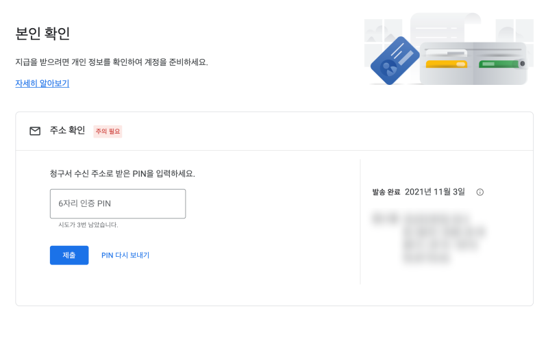 그래서 구글 애드센스 메인 화면에 우편이 발송되었다는 알람이 뜨기도 했는데요. 구글에서 발송된 PIN 번호를 입력해야지만 광고비로 번 금액을 제 통장으로 인출이 가능합니다.