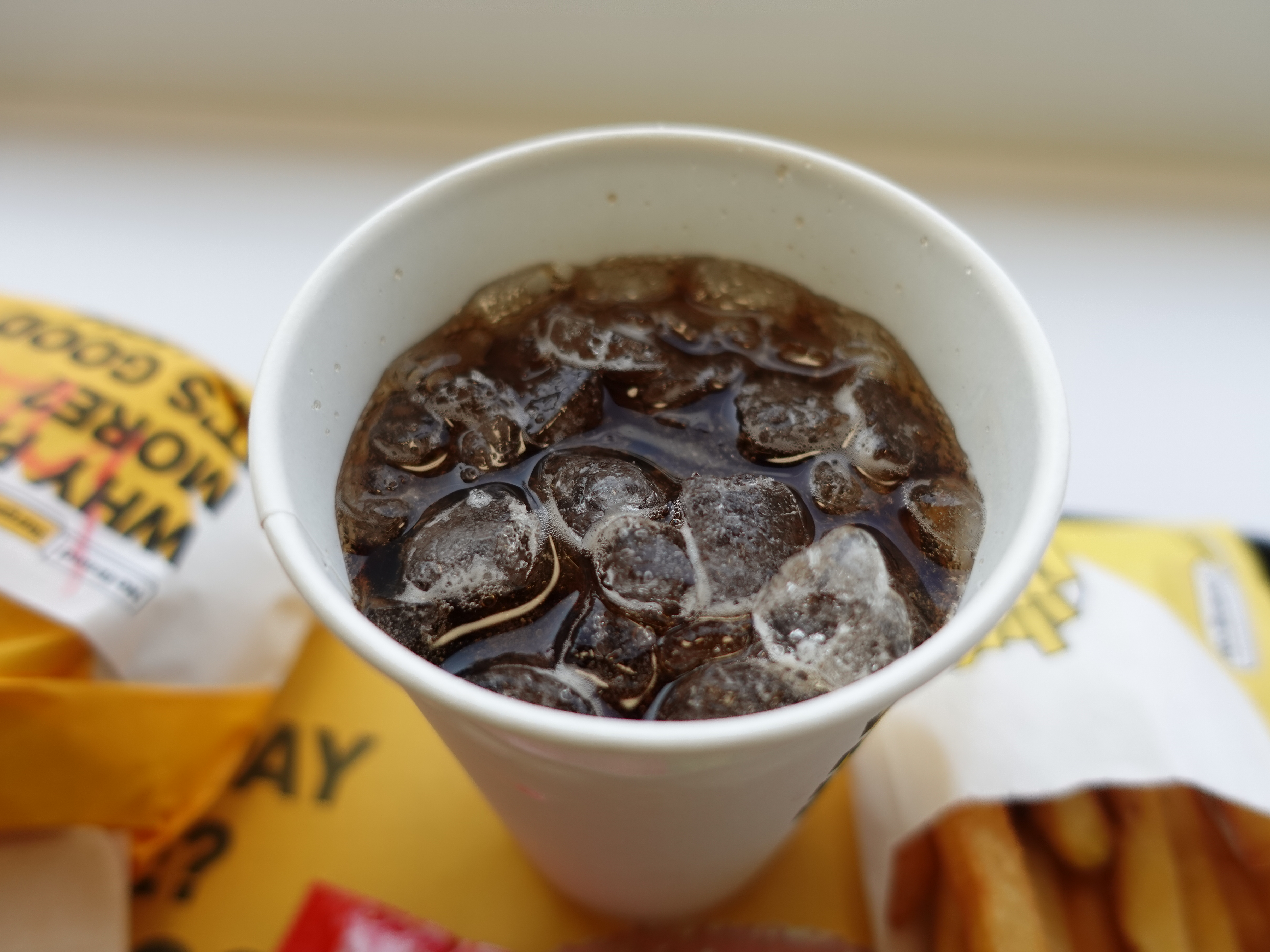 이렇게 주문한 순서대로 번호가 나오구요 기다렸다가 순서가 오면 주문한 햄버거 메뉴가 나옵니다. 햄버거 받고 빈컵에 음료수를 따르고 시식할 수 있는 2층으로 올라갔습니다.