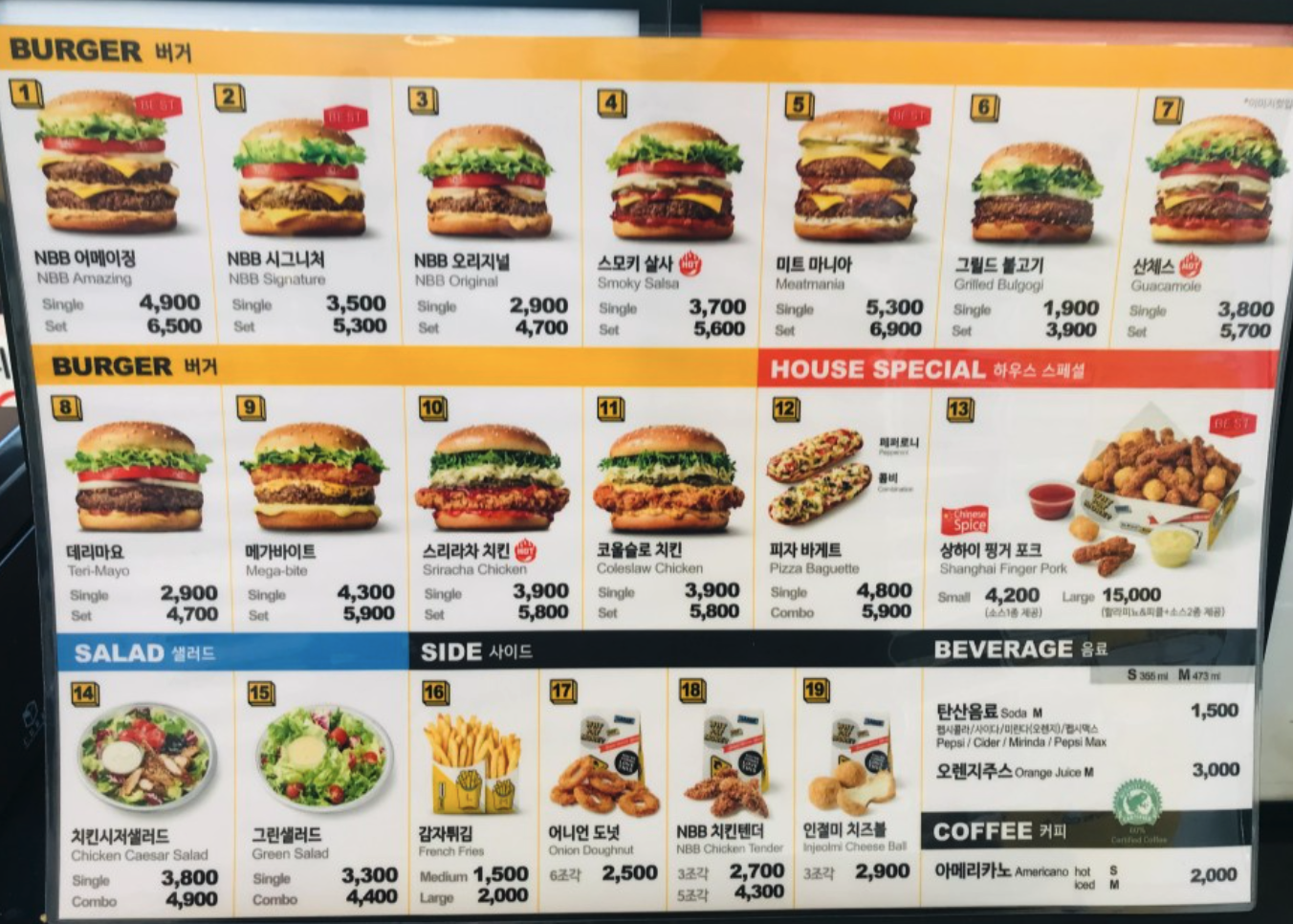 저는 노브랜드버거 오리지널 단품 (2,900원)과 데리마요 버거 세트(4,700원)를 하나씩 시켰구요. 총 7,600원이 나왔습니다. 이렇게 노브랜드버거 가격표 첨부해드리니 한번 참고해보시면 좋을 것 같습니다.