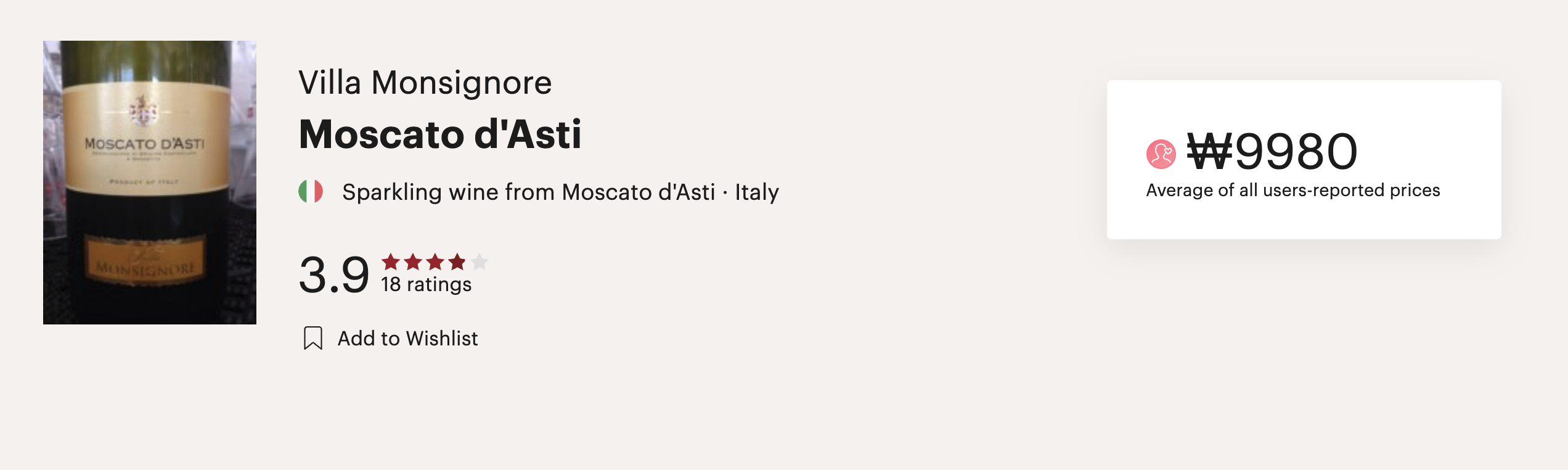 몽시뇨레 모스카토 다스티 201는 현재 비비노에서 평점 3.9점을 받고 있구요. 총 18명의 사람들이 별점에 참여했습니다. 가격은 9,980원으로 책정되어있는데요. 이마트트레이더스에서 저 역시 할인을 받아서 9,980원 대에 구매했습니다.
