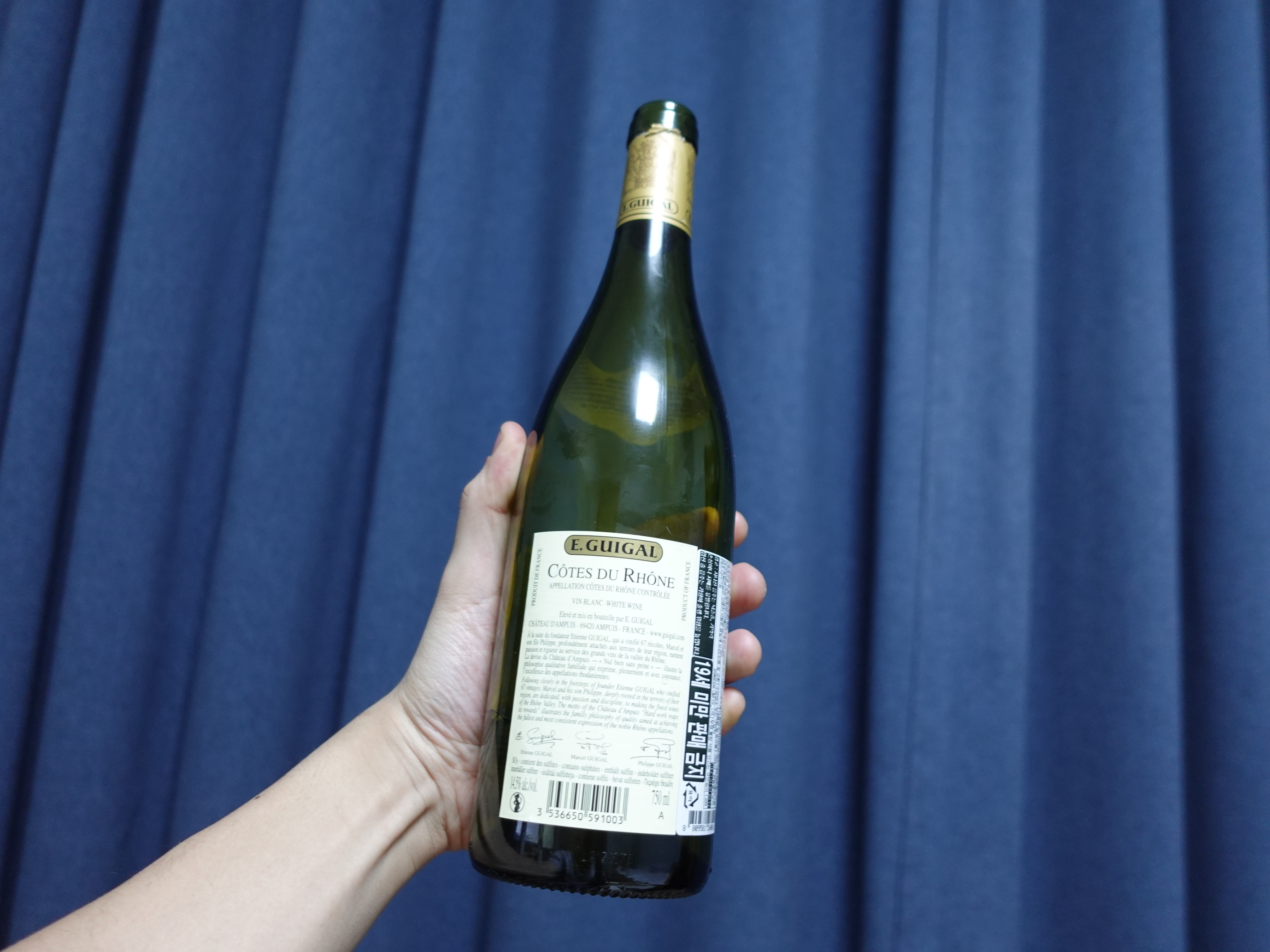 레이블에는 론 지역의 강물 삽화가 그려져있고 뒷쪽에는 와인에 대한 설명과 서명들이 적혀있습니다. 코르크를 개봉하면 옆쪽에 이기갈이라는 생산자의 스펠링이 적혀져 있습니다.