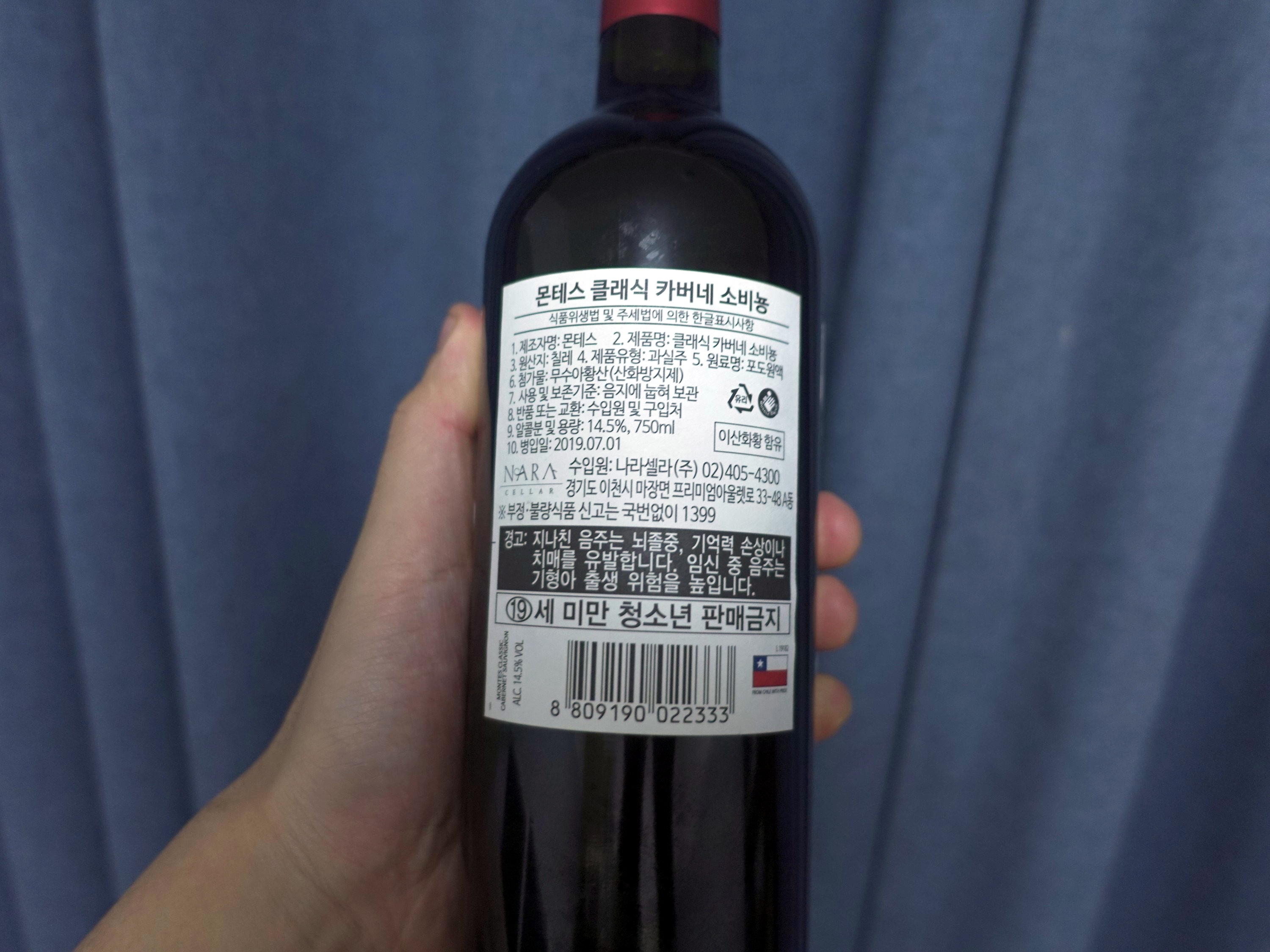 오늘 먹은 와인은 여러분이 친숙할 수도 있는 몬테스 클래식 시리즈의 카버네 소비뇽입니다.