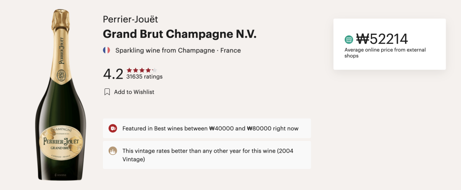 비비노에서도 평점 4.2점을 받을 만큼 사람들에게 평가가 좋은 와인입니다. 가격은 52,214원으로 책정되어있는데요. 페리에 주에는 샴페인의 역사상 최초의 드라이한 샴페인 "브뤼" 스타일을 만든 것으로도 유명한 역사있는 샴페인 하우스입니다.