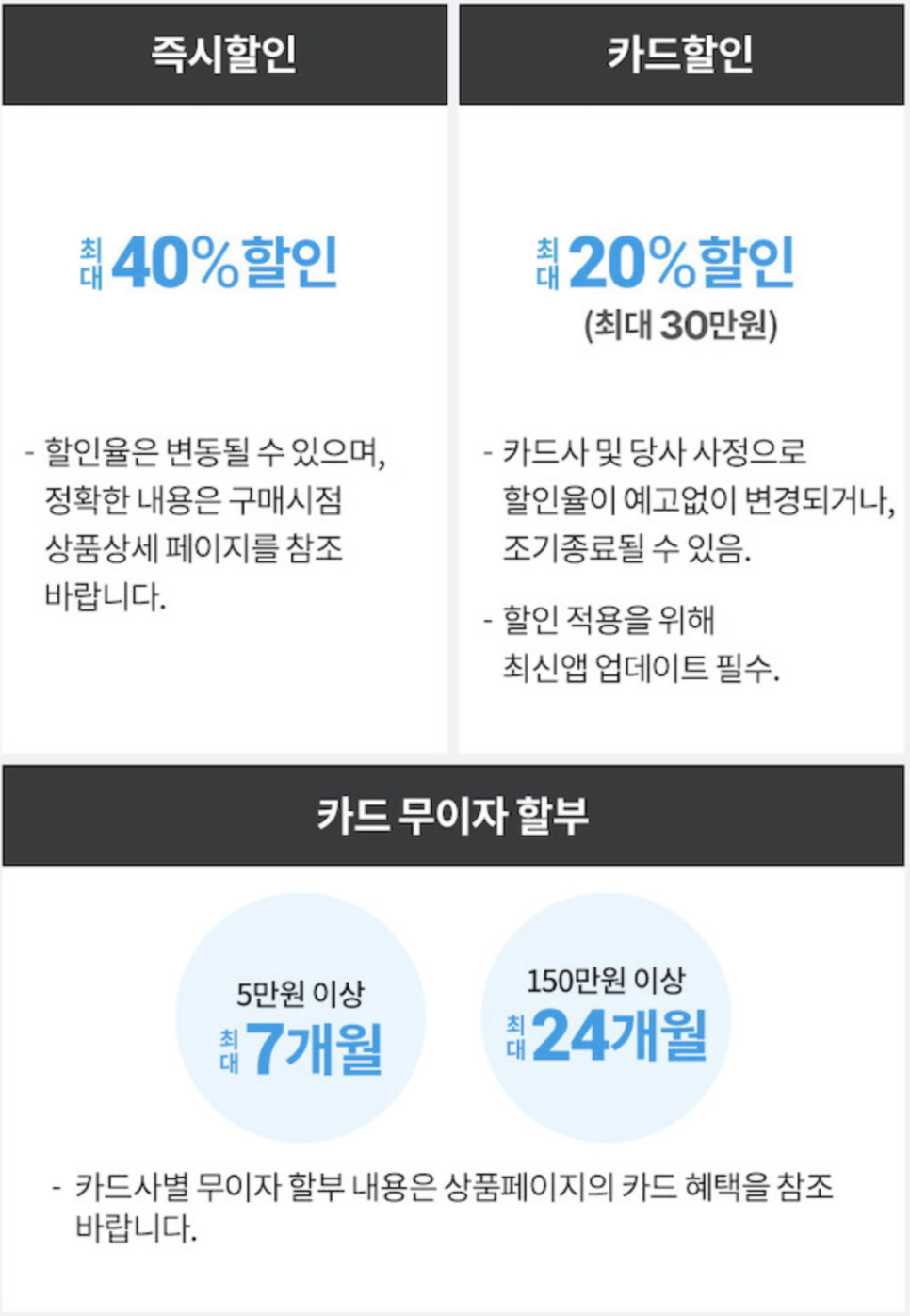 참고할 사항으로 카드 즉시할인 혜택은 최대 30만원까지 제한이 있는데 조기로 종료될 수 있기때문에