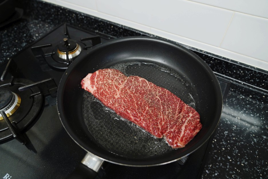 이후에 이렇게 소금과 후추로 간을 해주시구요. 팬에 기름을 두르고 처음에 충분히 팬을 예약해준 뒤에 고기를 앞 뒤로 구워서 육즙이 빠져나가는 것을 방지해 줍니다. 이후 약불로 변경한 후 자주 뒤집어 주면서 고기를 익혀주세요.