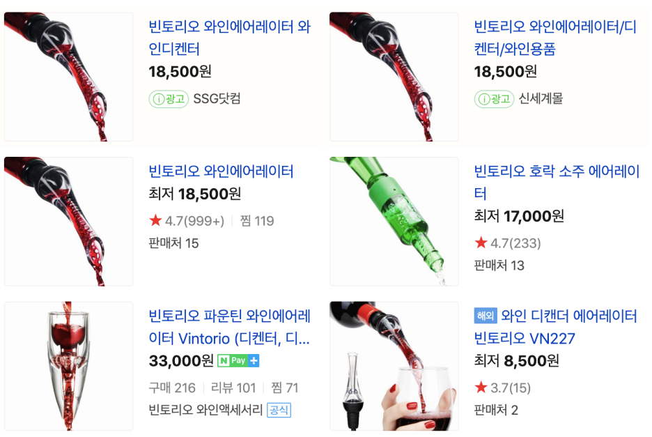 제가 사용했던 빈토리오 와인 에어레이터의 가격은 18,500원으로 책정되어있구요. 네이버나 오픈마켓등 다양한 채널에서 판매하고 있습니다. 혹시 내가 와인에 관심이 있다. 혹은 나는 너무 비싼 와인보다는 저렴한 와인으로 캐주얼하게 즐기고싶다 하시는 분들은 한번쯤 구매하셔서 사용하시면 아주 가격대비 아주 만족할 것 같습니다.
