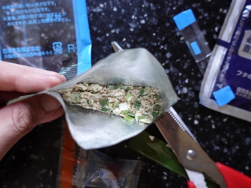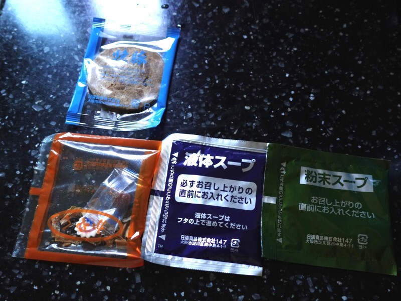 닛신 라오 돈코츠 라멘을 개봉하면 이렇게 4개의 봉지가 나오구요. 저번에 소유라멘과 같이 이번에는 차슈(돼지고기)가 들어 있네요.