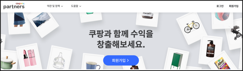 그렇다면 백번 듣는 것보다 한번 해보는게 좋겠죠? 쿠팡파트너스를 바로 시작해보겠습니다. 우선 쿠팡파트너스 사이트에 접속해서 회원가입을 바로 진행하시고요. 쿠팡 아이디가 있다면 쿠팡 아이디로 로그인하시면 됩니다.