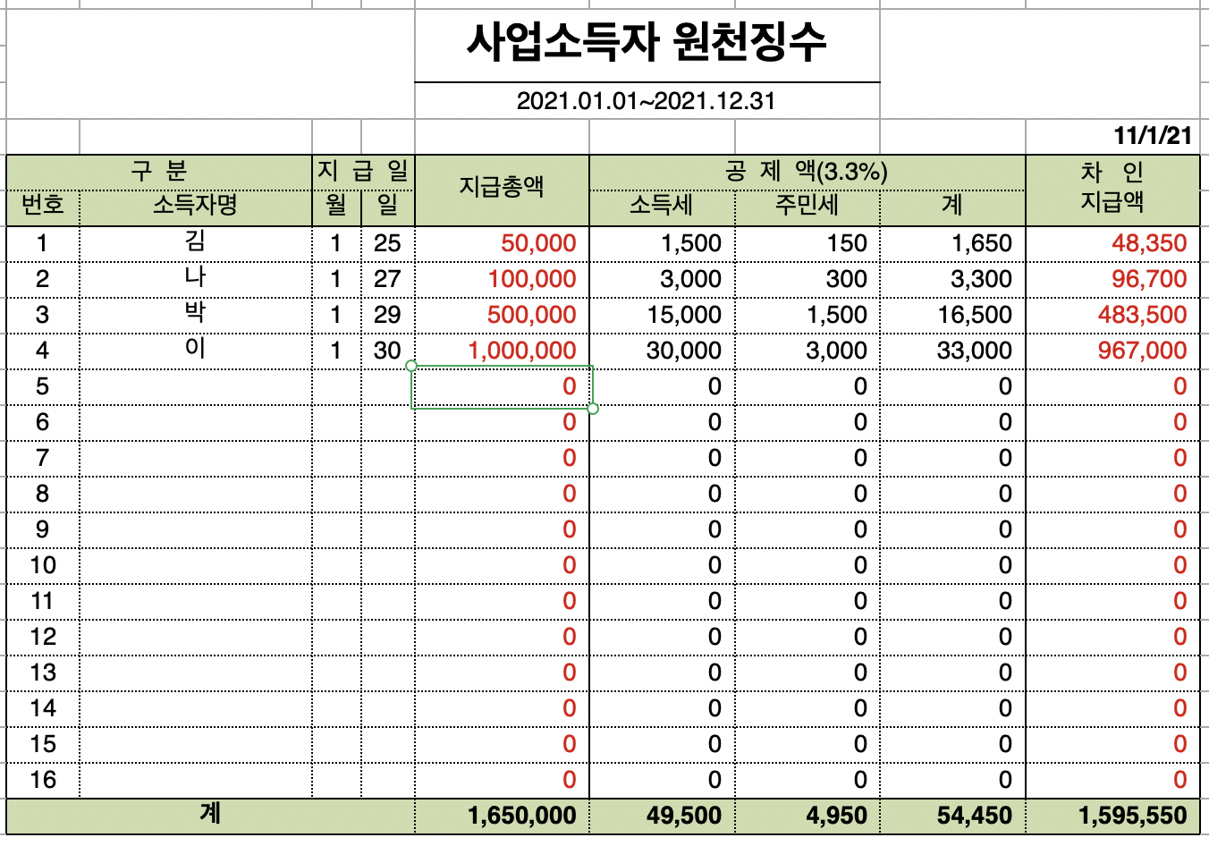 업무가 다 끝나면 한 달에 한번씩 급여를 지급해야하는 상황이 발생해요. 그런데 프리랜서에게 주민등록증과 통장사본을 받은 후에 3.3%를 공제하고 지급을 해야하기 때문에 계산하기가 참 귀찮을 때가 많이 있었어요.