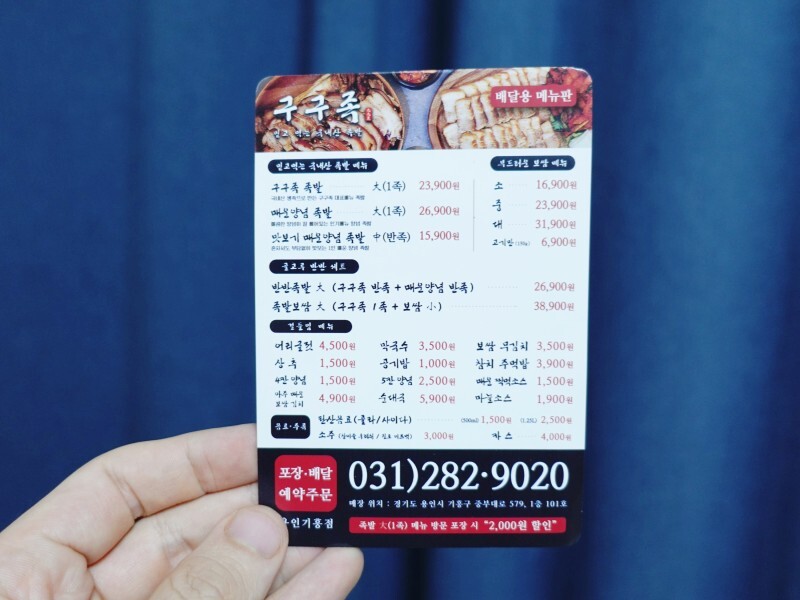 첫 번째 배달음식점은 구구족 용인기흥점입니다. 여기는 강남대 앞쪽에 위치해있구요. 포장 배달을 전문으로 하는 족발집입니다. 구구족은 체인점이라서 여기저기 자주 보이는 족발집인데요.