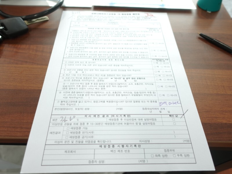 병원에 방문하면 간단하게 문진표를 작성하게 되고요. 밖에서 대기하면 금방 접종실로 안내를 받게 됩니다.
