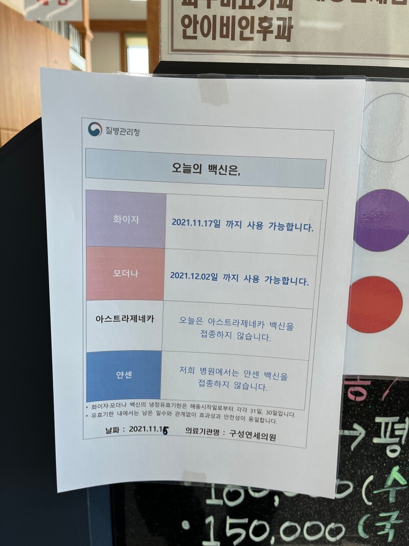 그리고 대망의 11월 16일이 되어서 집 근처 병원에서 모더나 부스터샷 접종을 시행하고 왔습니다..! 저는 집 근처에 있는 구성연세의원에서 접종을 받기로 예약하였고요.