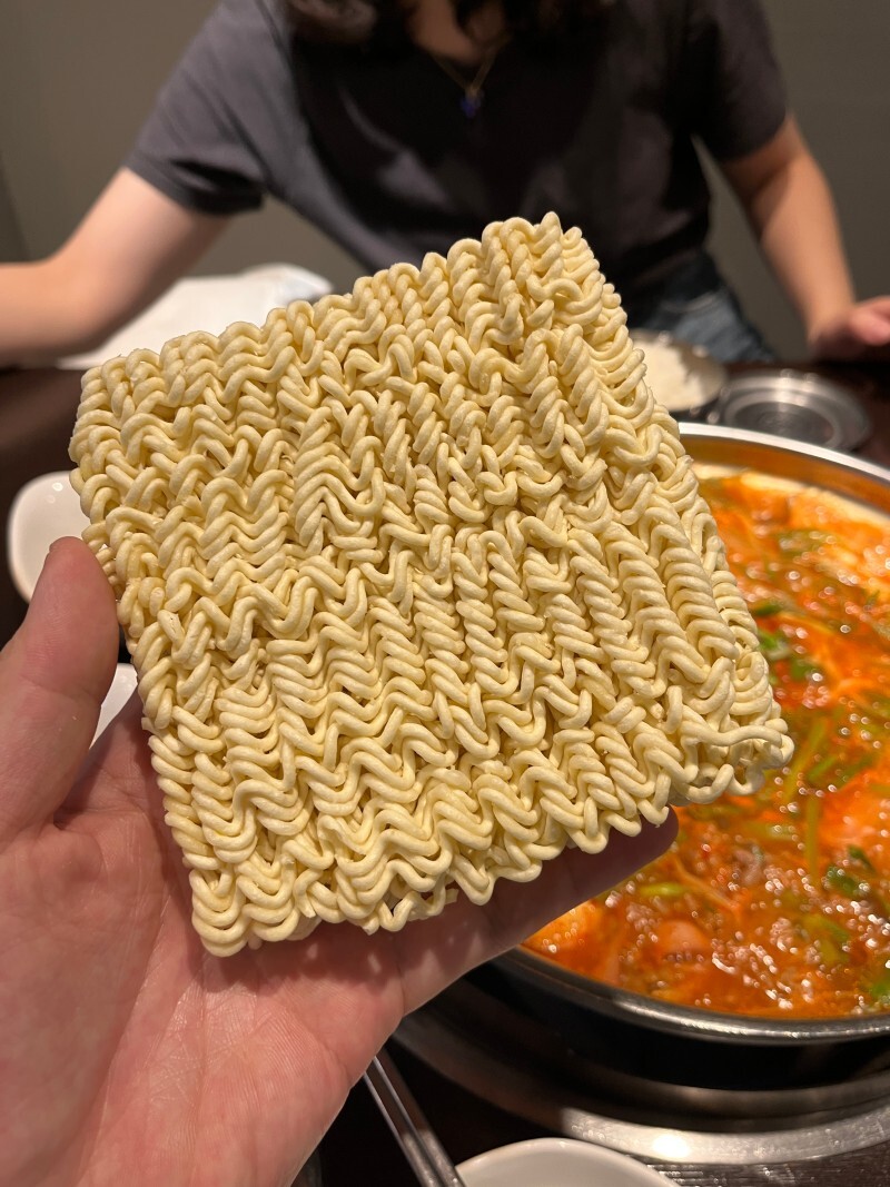 라면 사리 넣은 상태에서 바로 부대찌개 맛을 보았어요. 부대찌개 오랜만에 먹으니 정말 맛있었고 아까 위에서 언급했던 미나리가 올라가 있어서 국물맛이 더 시원하고 향도 좋았어요.