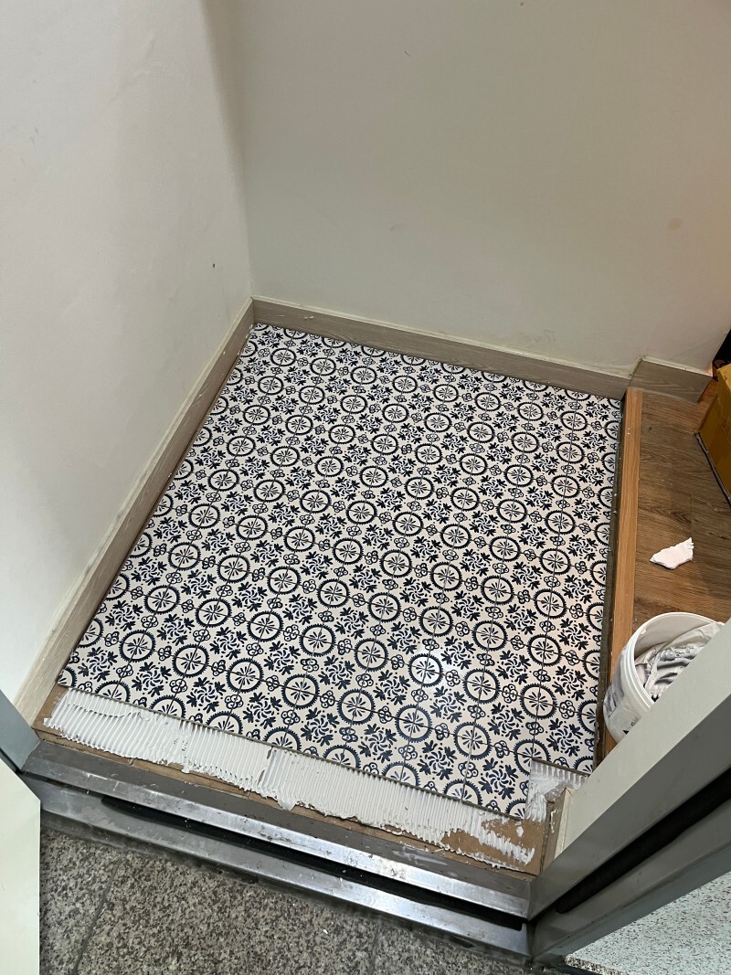 무튼 이래저래해서 타일들을 절단하는 것까지 완성을 하였고요. 이걸 가지고 현관으로 가서 마무리로 딱 붙여주면!