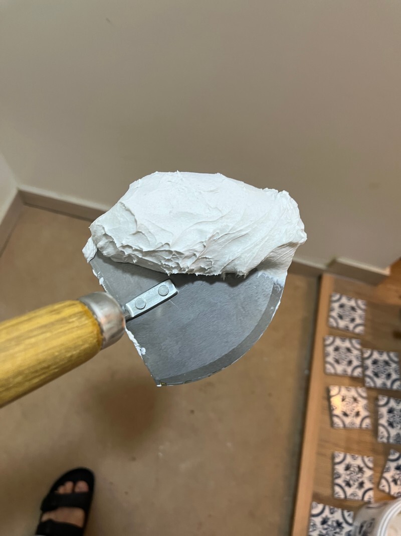 툭 던져준 세라픽스 접착제를 8mm 톱날 고대로 잘펴발라 주면 되는데요. 여기서 한 가지 팁은 톱날방향을 한쪽으로 일정하게 펴서 발라주는 것이 접착을 하는데에 조금 더 좋다고하네요.