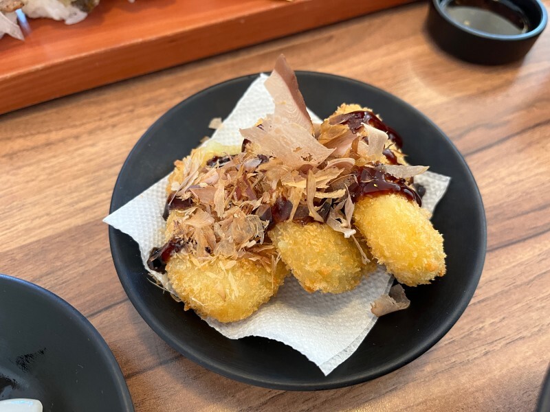 이렇게 미니 우동이 함께 나오고요. 고로케도 하나씩 먹어보았어요. 의외로 고로케가 까스어부시랑 소스와 함께 나오는데 바삭하고 맛있어서 좋았어요.
