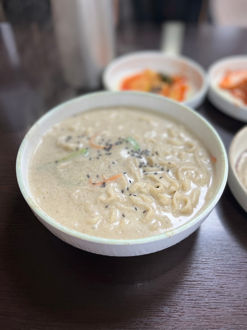 한 입 맛보자 정말 고소한 내음이 입안 가득 퍼졌고요. 칼국수가 굉장히 뜨거웠는데 면이 쫄깃쫄깃한게 굉장히 신기했어요. 면발이 통통하고 쫄깃해서 먹는 재미가 있었습니다.
