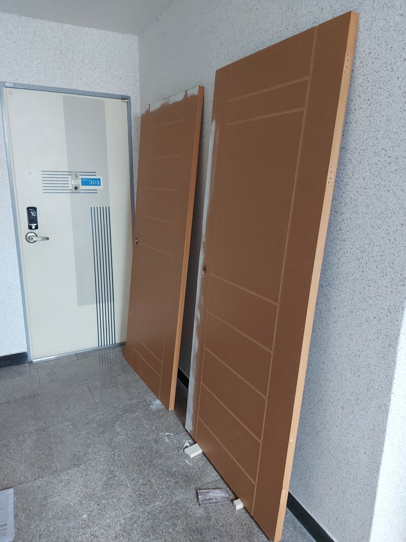 작업기간은 이틀정도가 소요되었고요. 일반적인 문짝이 아니라 음각(?)이 있는 문이어서 샌딩작업과 빠데로 평탄화 작업까지 해야했기때문에 시간이 좀 더 많이 들었던 것 같아요.