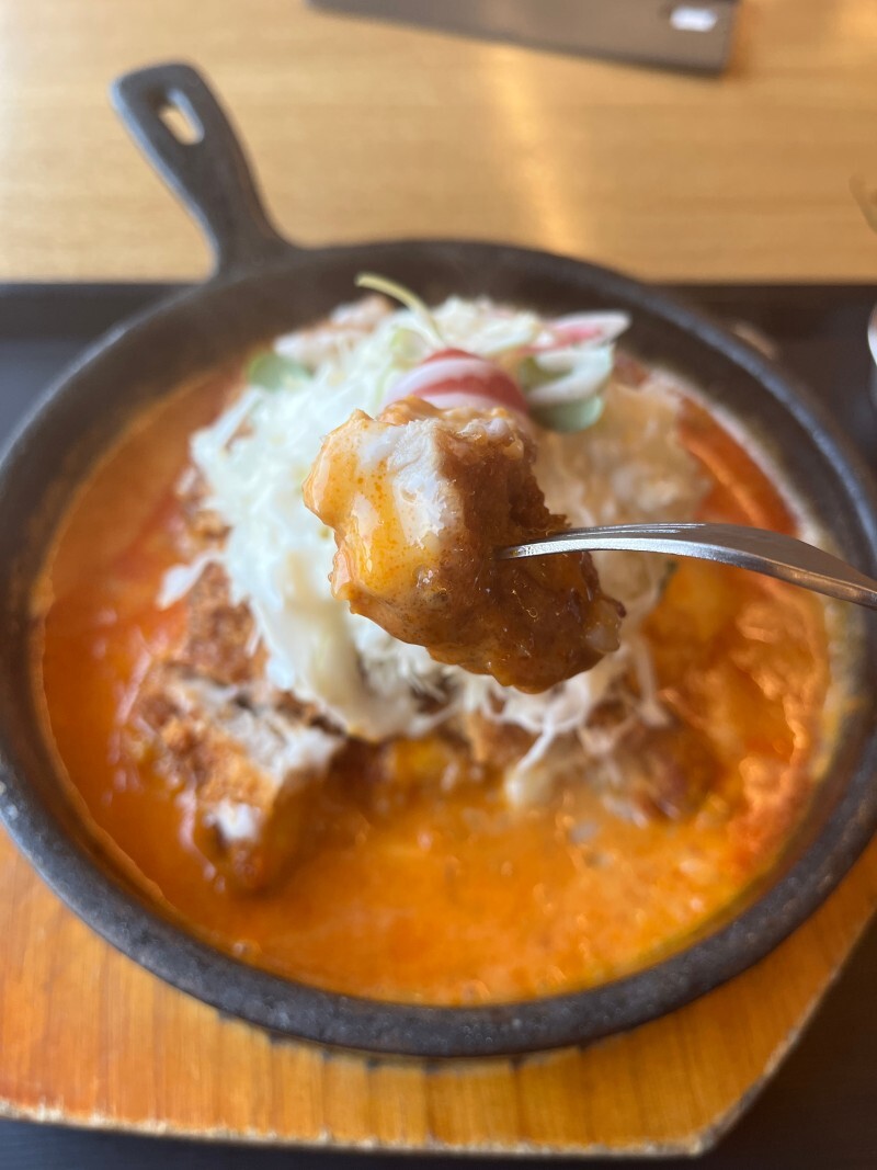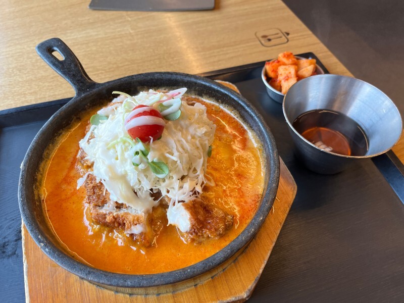 주문했던 더블치즈 돈까스가 나와서 바로 찍은 모습이고요. 더블치즈라는 이름에 맞게 소스에도 치즈가 녹아져 있는 느낌이었고 안쪽에는 모짜렐라 치즈가 숨어서 녹아져 있더라고요.