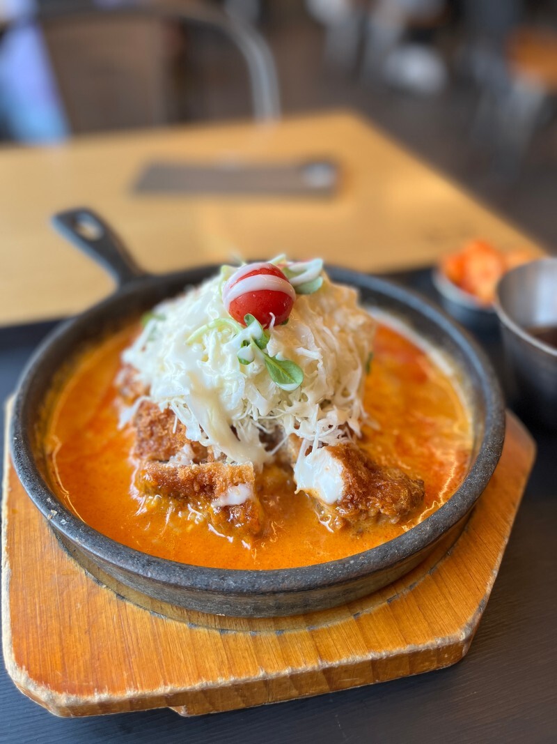 그리고 특이했던건 돈까스 위쪽에 샐러드가 깔려있어서 신성했고요. 밥은 따로 안주나? 했는데 아래에 밥이 깔려있더라고요. 그래서 약간 밥이 리조또처럼 치즈와 함께 먹을 수 있어서 굉장히 맛있었어요.