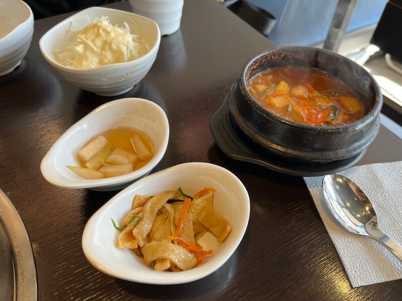 우선은 바로 반찬과 밥, 그리고 된장찌개가 나와버리고요. 약간 혜자스러운 구성이라 좀 좋았습니다. 오랜만에 얼큰한 된장찌개를 먹는 것 같아서 좋았어요.