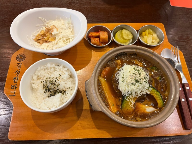 보글보글 뚝배기에서 맛있게 끓고있는 경성함바그의 모습.. 너무너무 맛있어보였어요. 그리고 구성은 샐러드, 밥, 깍뚜기, 피클, 파인애플이 함께 나왔고요. 샐러드위에 드레싱과 후레이크 토핑이 인상적이었습이다.