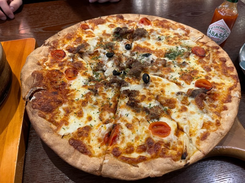 피자 슬쩍 들어서 한 입! 아 피자 합겹이에요. 상당히 얇은 씬 피자고요. 위에 토핑들도 아주 적절하게 섞여있어서 마음에 들었어요. 느끼하지도 않고 타바스코 소스 톡톡 털어서 먹으면 아주 개운한 맛이 느껴졌습니다.