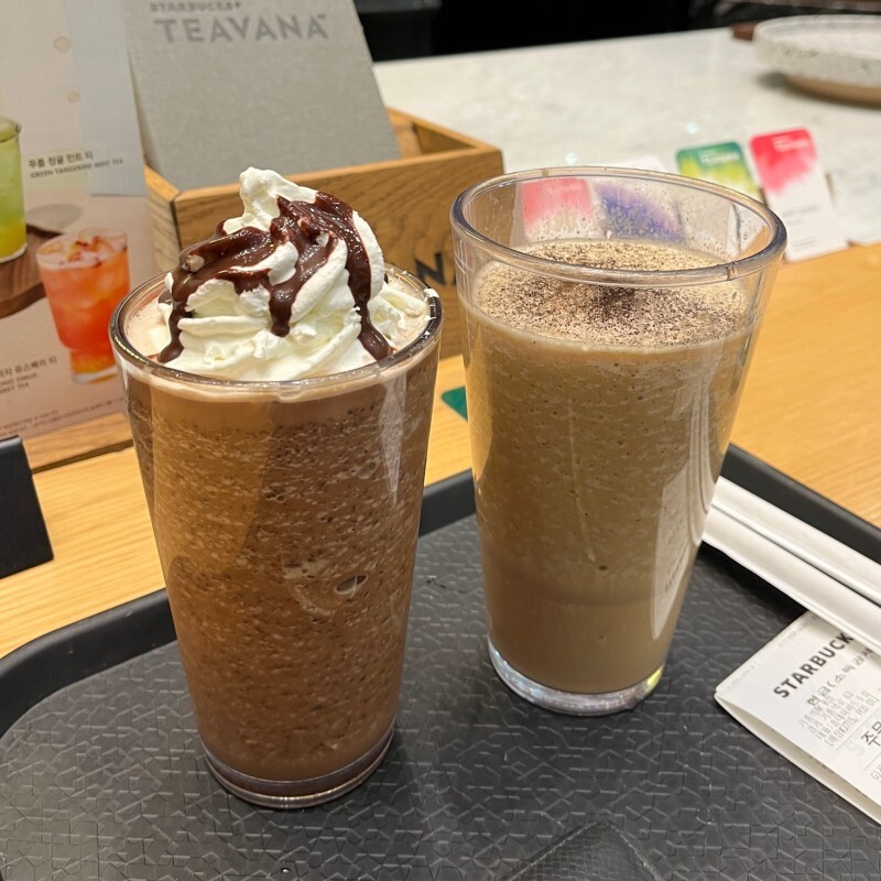 그리고 바로 음료를 주문하고 카운터로 직행! 저희는 이날 자바칩프라푸치노(6,100원)와 더블에스프레소 프라푸치노(6,100원)를 시켜서 자리로 돌아왔어요.