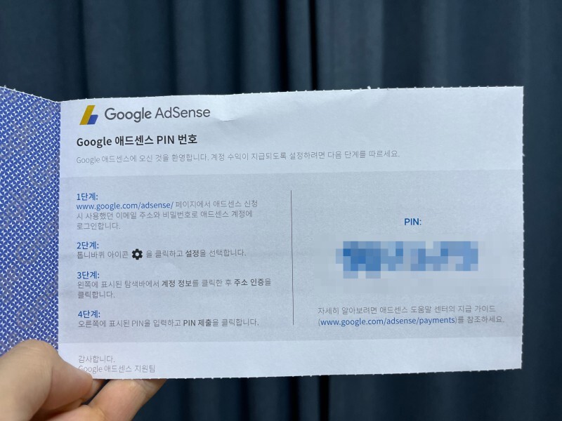 두근두근.. 이렇게 애드센스 핀번호 우편을 열면.. 보이는 것처럼 안에 핀번호가 나와있고 왼쪽에 핀번호를 입력하는 방법이 세세하게 나와 있습니다..!