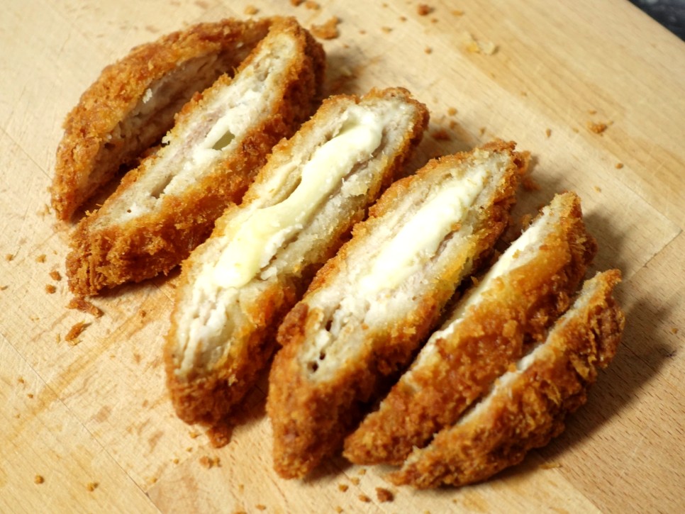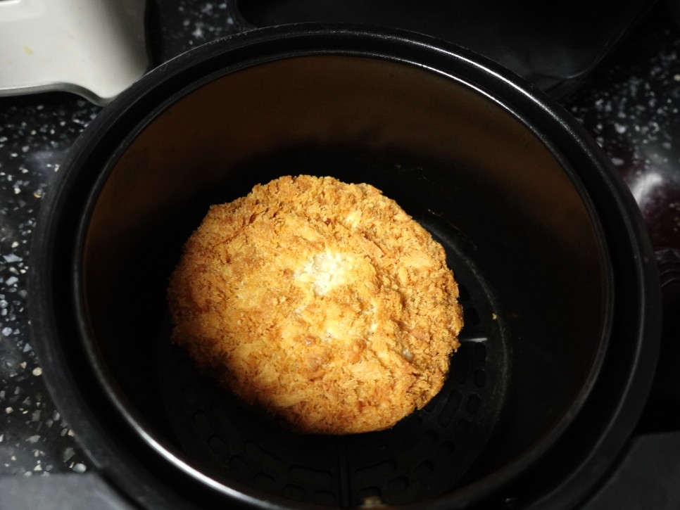 짠! 에어프라이기를 돌리기 전 보다 더 노랗게 황금빛으로 튀겨진 고메치즈돈까스를 만날 수 있었습니다. 확실히 위의 사진과 비교해보면 색의 차이가 느껴지실거에요. 한번 썰어 보았습니다.