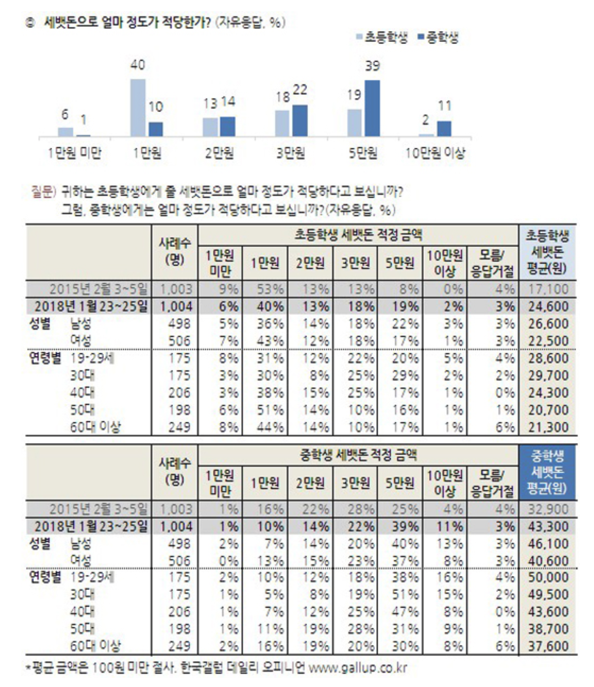 2018년 1월 23~25일 전국 성인 1,004명에게 설날 새뱃돈에 대해 질문한 결과 초등학생 세뱃돈은 '1만 원'이 적당하다는 의견이 가장 많았다다고 합니다.