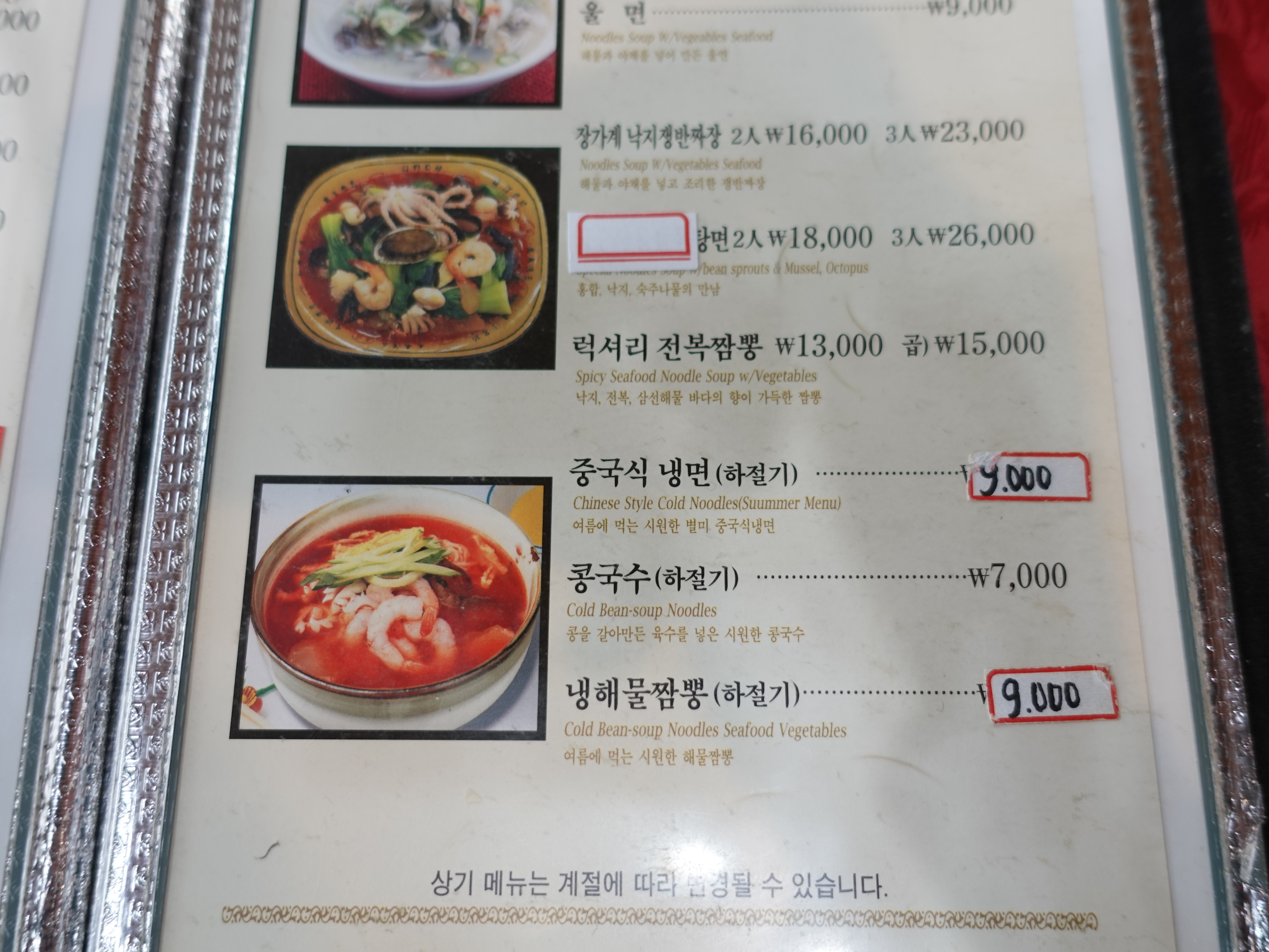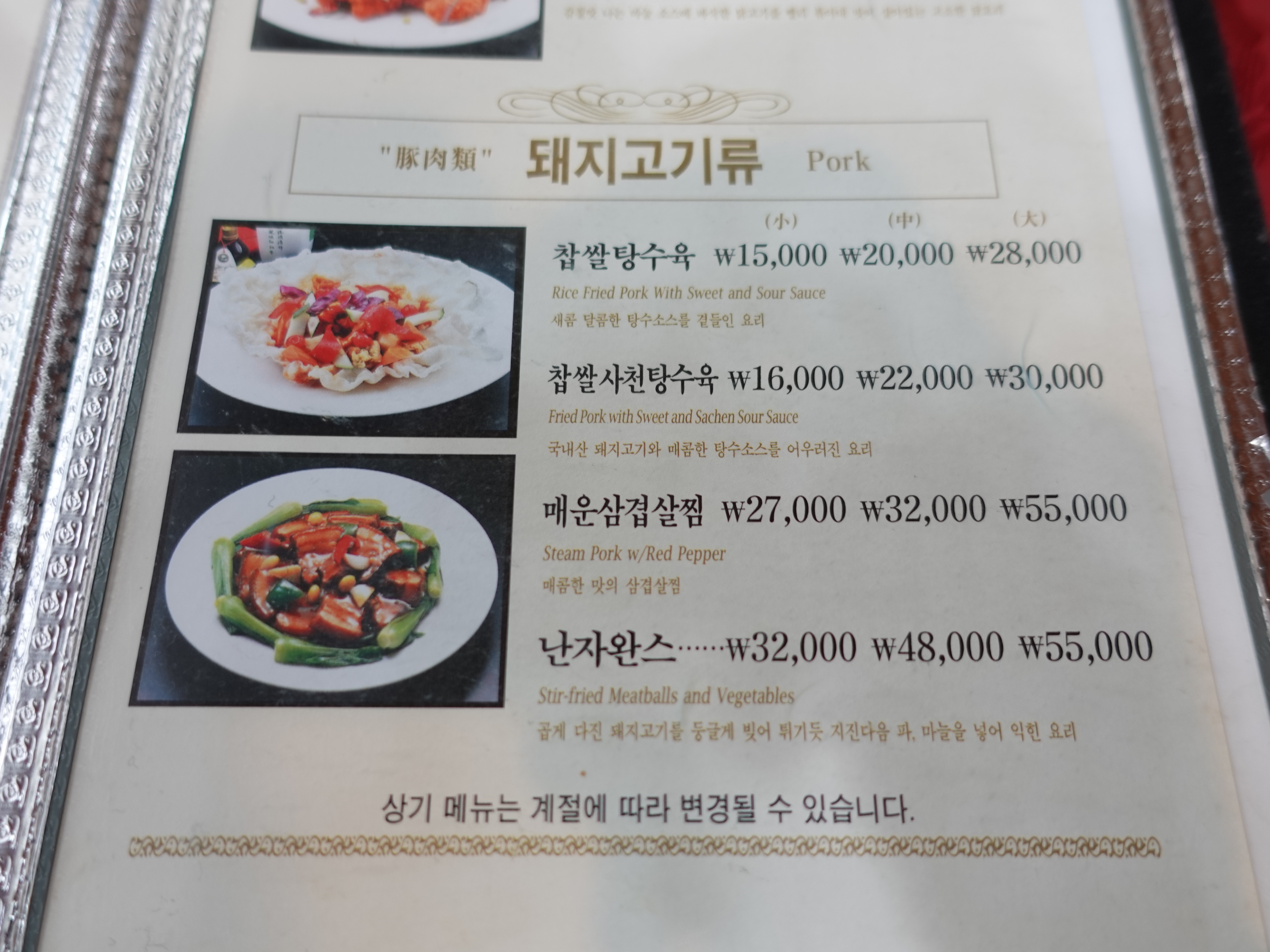 메뉴판은 식부와 요리부분을 찍었는데요. 저는 이날 보통 짜장면이 아닌 삼성 간짜장과 짬뽕을 주문했습니다. 사실 언남동 맛집 장가계에 유명한 메뉴는 짬뽕인데요. 두개 메뉴를 보시죠.