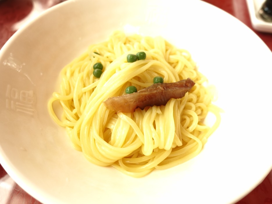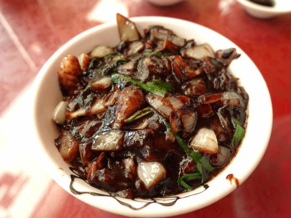 삼선간짜장(8,000원) 주문 시 이런 구성으로 나오구요. 면 위에 전복(?) 같은 해산물이 하나 올려져있는게 인상적이었습니다. 소스를 면에 부어보았습니다.