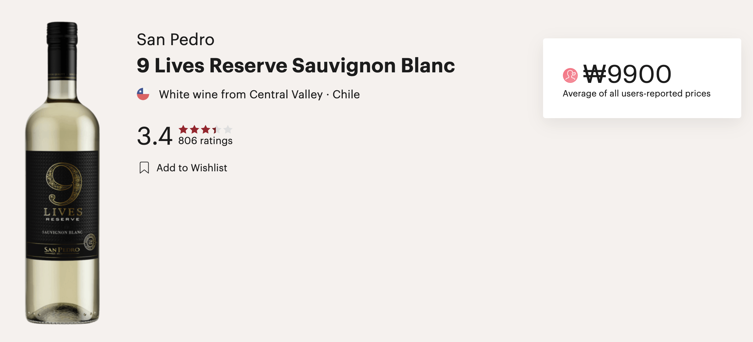 나인라이브스 리저브 소비뇽 블랑은 비비노에서 평점 3.4점을 받고 있구요. 총 806명의 사람들이 별점에 참여했습니다. 가격은 9,900원으로 책정되어있는데요. 이마트트레이더스에서 11,900원 대에 판매중이었습니다.