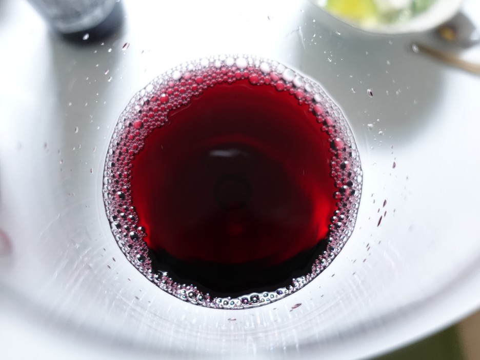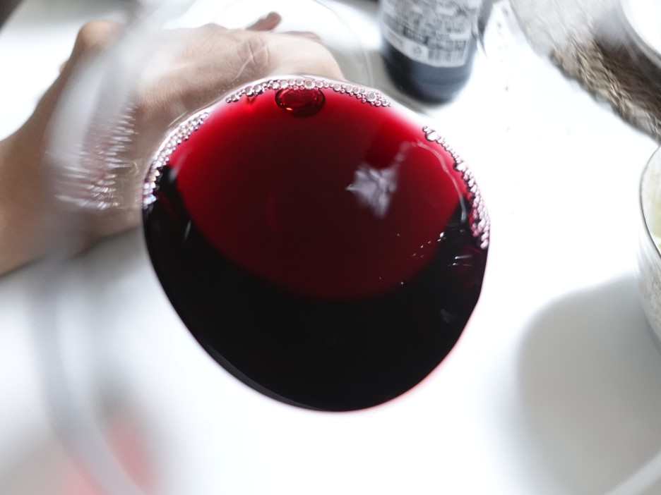 처음 잔에 따랐을때의 모습입니다. 붉은 루비색의 투명한 느낌으로 병아래 손이 비추는 모습이었구요. 향에서는 후추향과 오크향 알콜성 산향이 조금 강하게 났습니다. 향에서 느껴지는 매력은 그다지 못느낀 상태에서 한 모금을 마시니, 검은 과실(블랙베리, 자두 등) 당도가 느껴졌습니다.