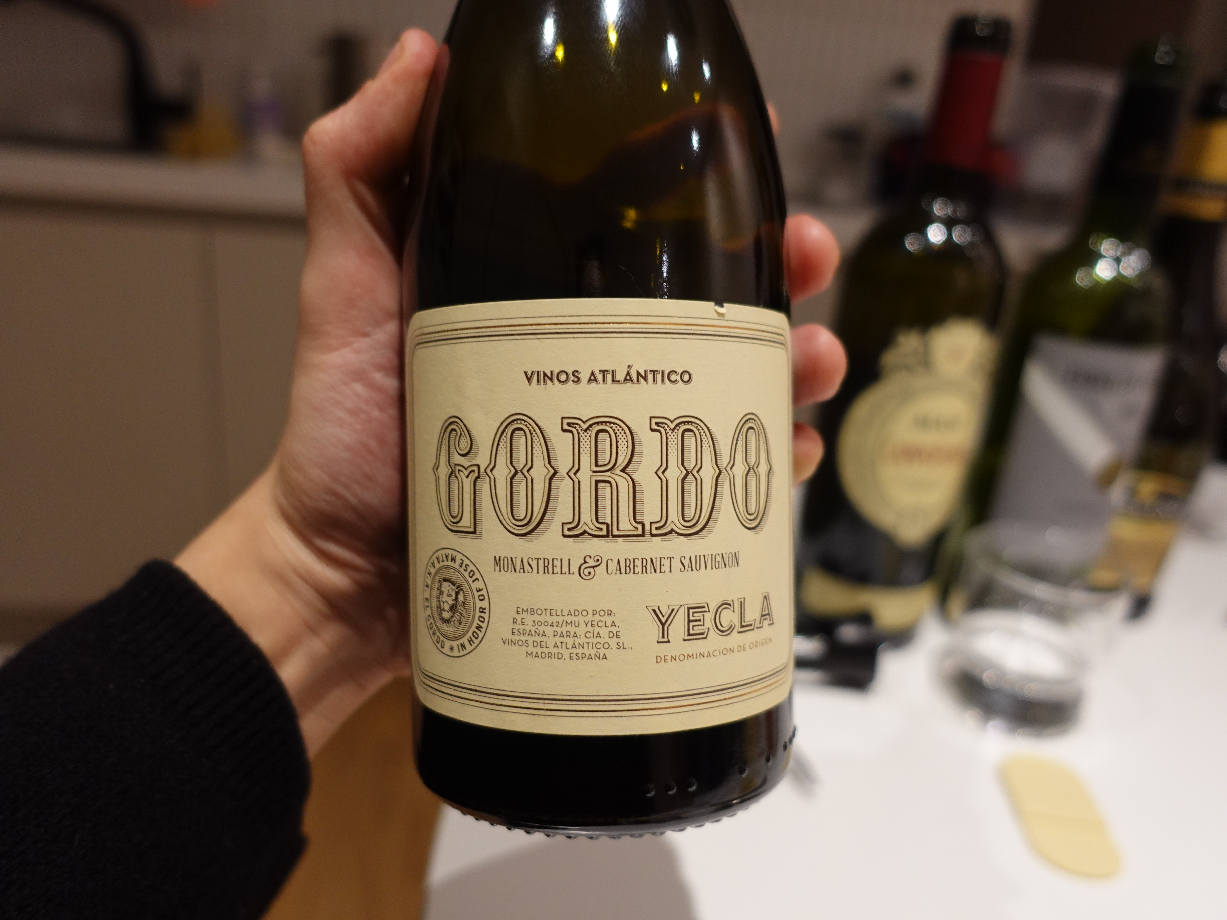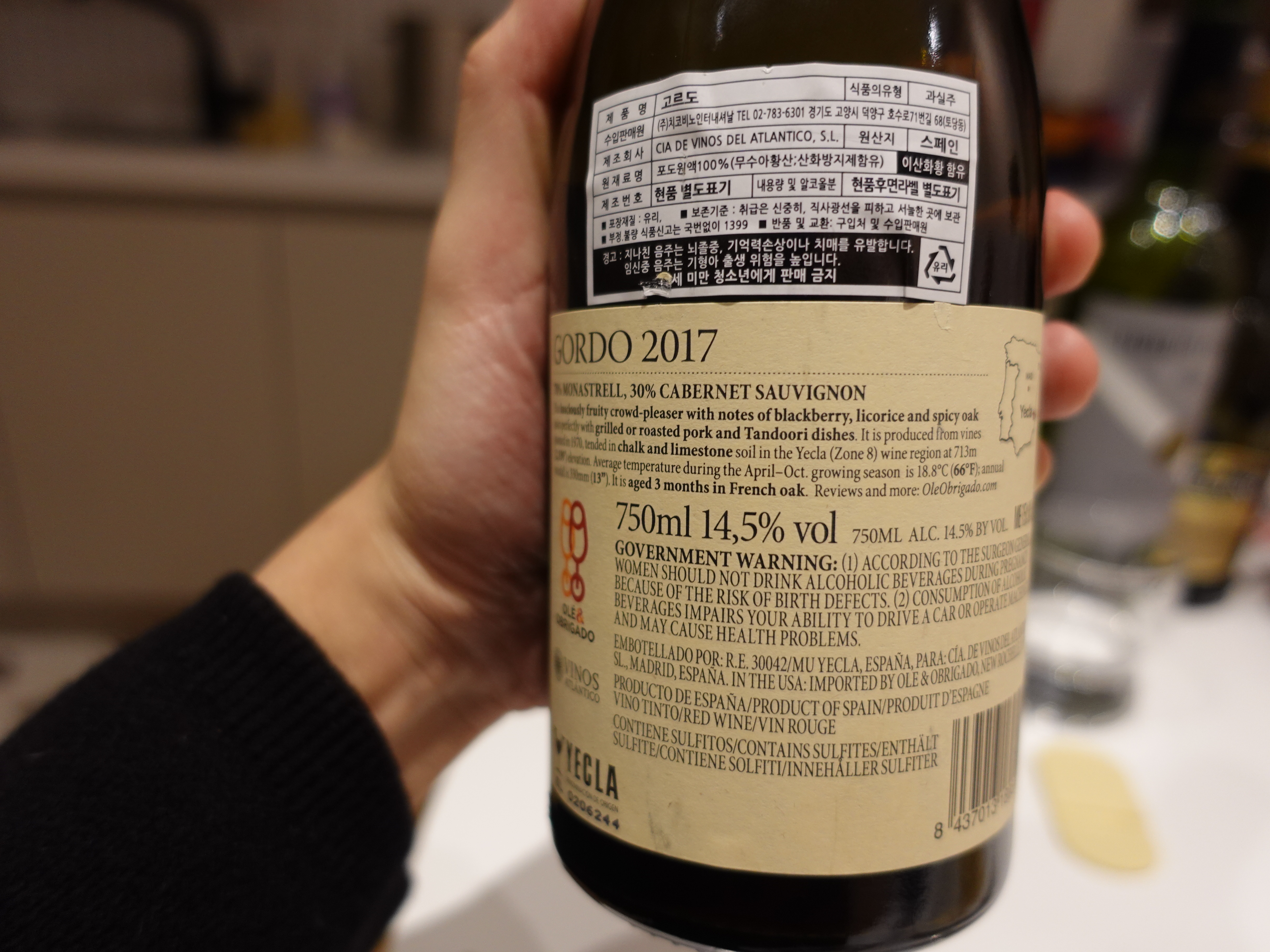 레이블에는 고르도 라는 폰트가 굉장히 이쁘게 들어가있구요 아래에 모나스트렐과 까르베네 소비뇽의 품종이 블렌딩되어 있다는 정보와 스페인 예클라에서 만들어 졌다는 지역명까지 간결하고 심플하게 들어있습니다.